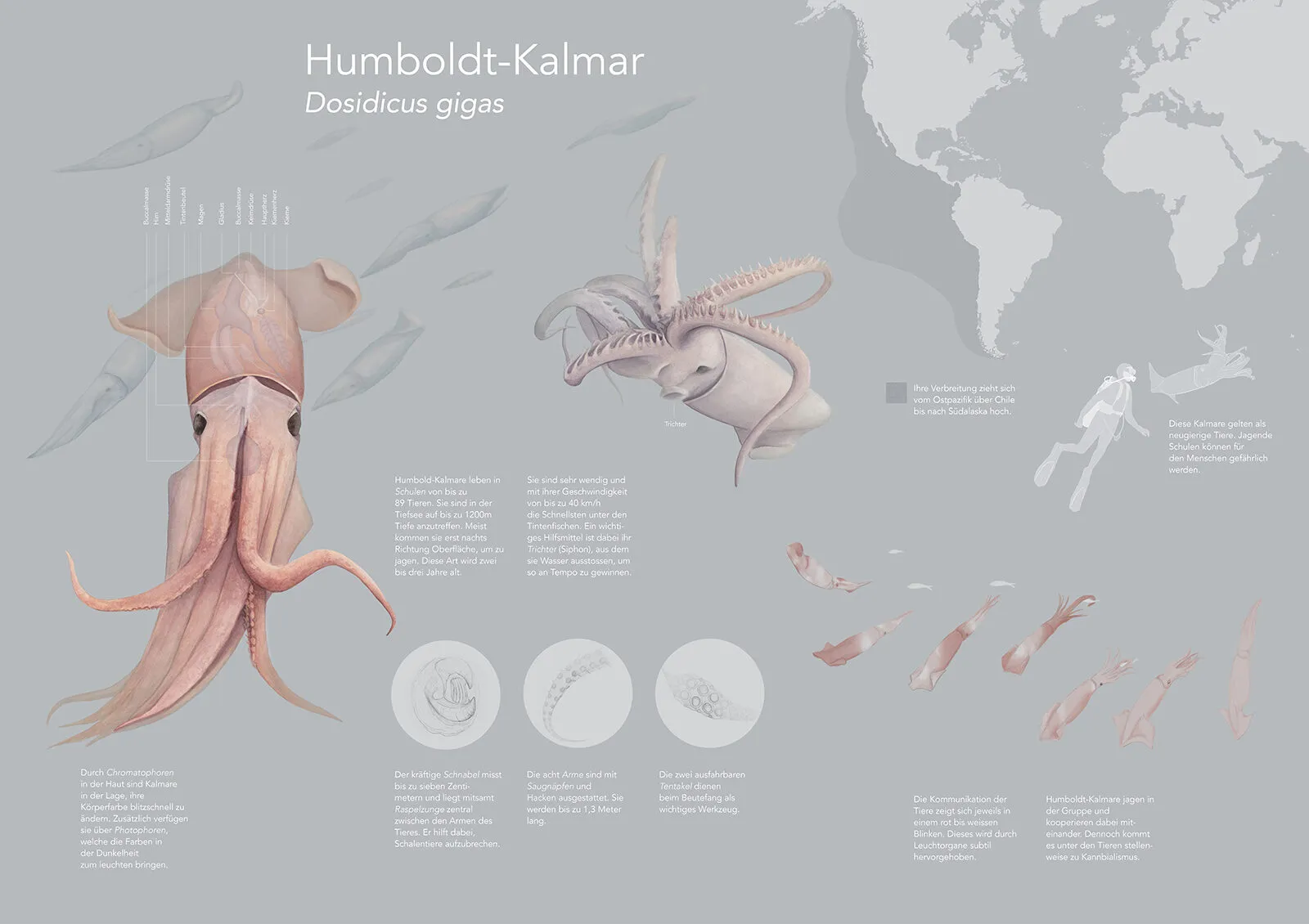 Der Humboldt-Kalmar und der gewöhnliche Krake sind je für sich bemerkenswerte Tiere. Allerdings verdienen vor allem ihre Unterschiede ein besonderes Augenmerk: Herausragend sind neben der Anatomie und dem Aussehen das jeweils individuelle soziale und kommunikative Verhalten. Diese Arbeit stellt einige Unterschiede und Gemeinsamkeiten der beiden Kopffüssler vor.