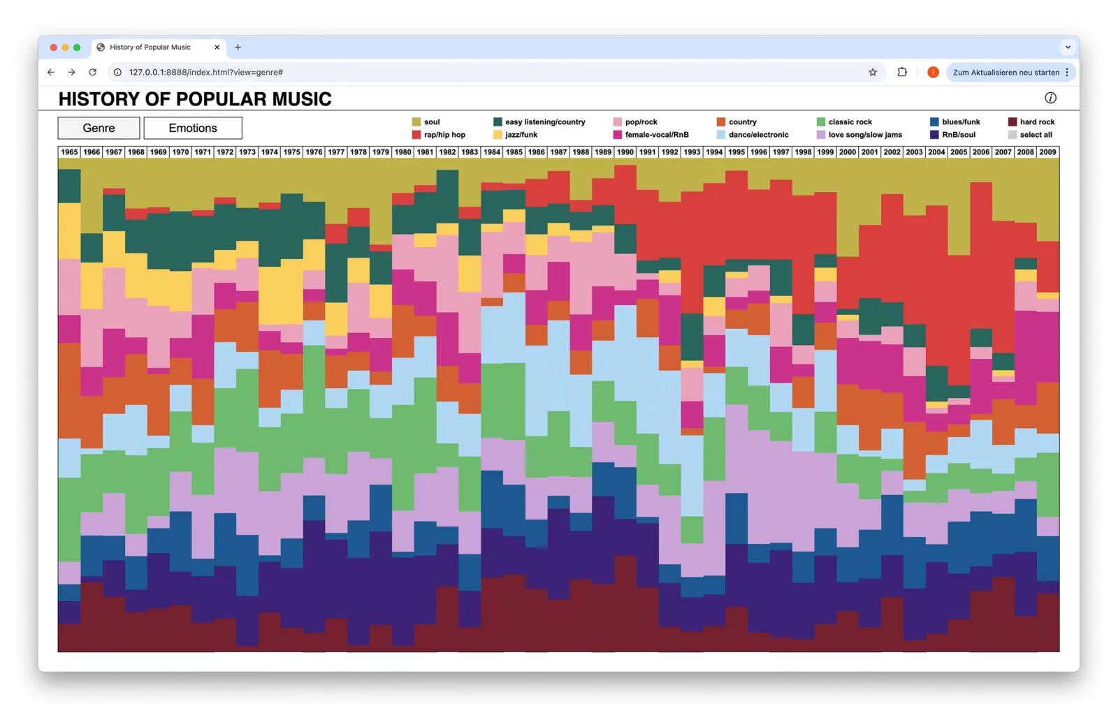 What does the passage of time sound like? Using digital analysis methods and publicly available music data, the transformation of popular music from 1965 to 2010 is made visible through the Billboard Hot 100. This interactive data visualization reveals how genres and emotions have evolved over four decades – inviting users to dive into the history of pop music. It not only uncovers cross-temporal trends but also highlights individual songs and artists behind the data. In this way, music becomes readable – as a reflection of societal change.