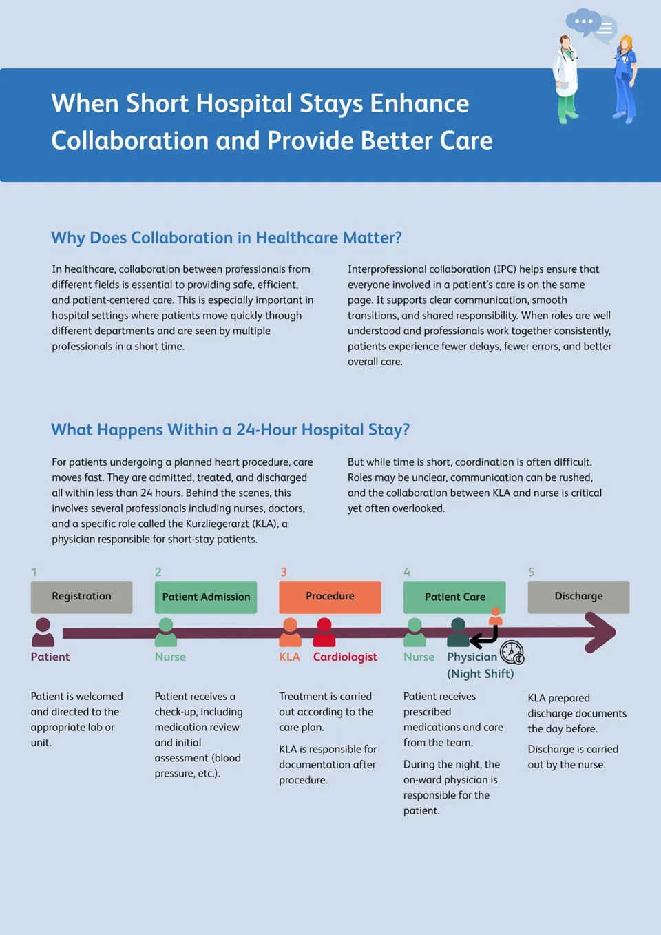 This thesis looks at how nurses and doctors collaborate during short hospital stays, such as for heart procedures. Using interviews, observations and creative methods, it uncovers hidden hurdles in communication, unclear roles and spatial constraints. To address these, two simple yet effective interventions were developed: a shared handover ritual and a new patient support role. The project highlights how small, thoughtful changes in daily routines can improve teamwork and make hospital care more coordinated, human and safe.