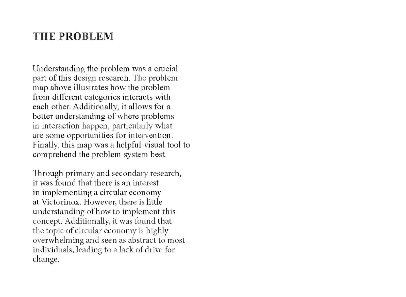By applying diverse design methods, it was found that there is hesitancy in implementing change from Victorinox that derives from the lack of external pressure to abide by the current trends. Therefore, by understanding the mentality of the people for whom this design intervention is created and those who will design the intervention, this design research project could estimate the value creation and threats of implementing a circular economy at Victorinox Travel Gear.