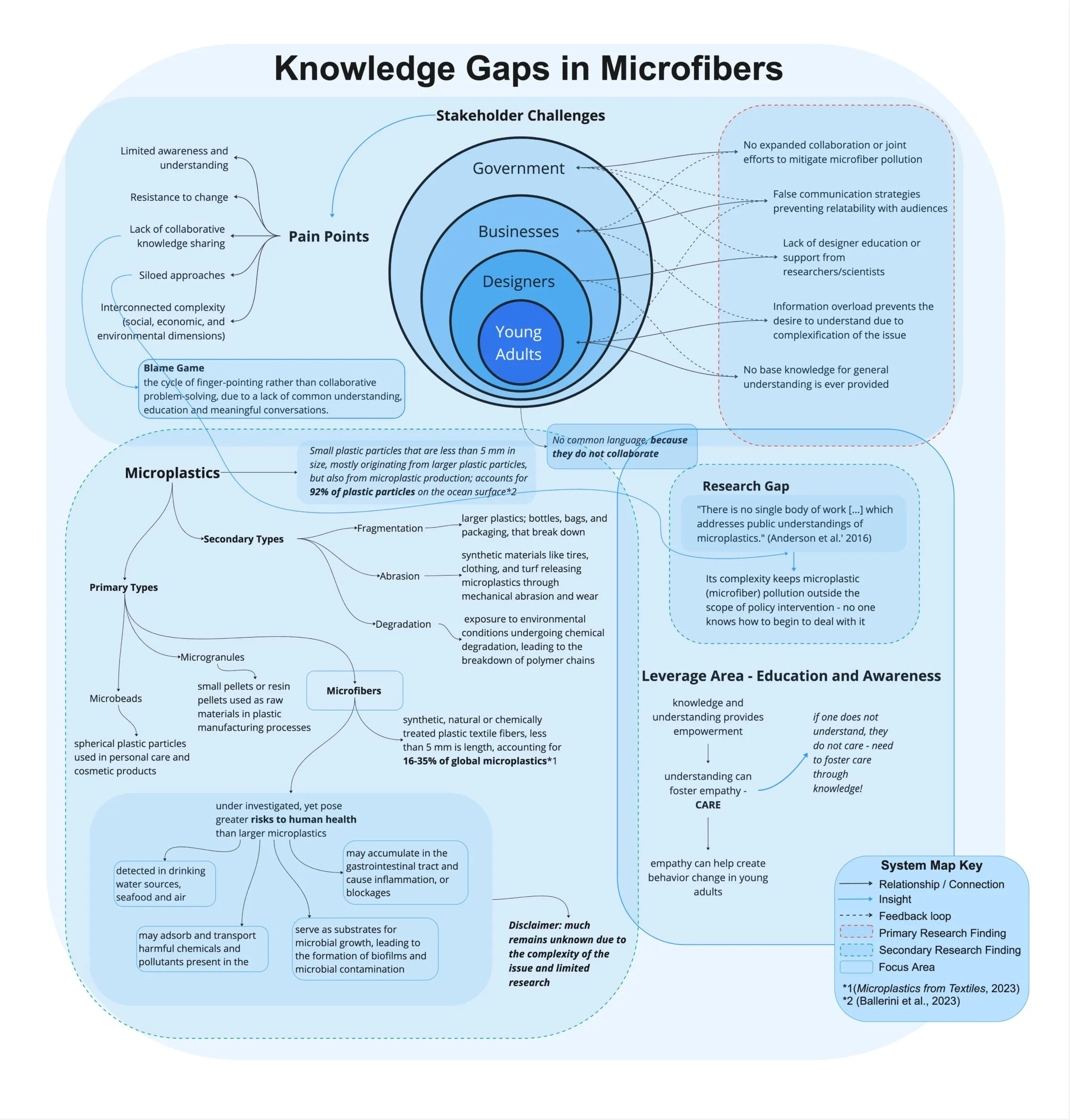 This thesis explores the critical issue of microplastic pollution in our oceans, focusing specifically on microfibers – an under-researched and underrepresented form of plastic pollution stemming from textile production. Through conducting a thorough literature review and interviewing young adults, researchers, designers, and educators, this research reveals the intricate nature of the problem. This thesis highlights isolated perspectives of stakeholder groups and identifies key challenges, necessitating a design management approach for effective intervention. As Sir David Attenborough once said, «If children grow up not knowing about nature and appreciating it, they will not understand it, and if they don’t understand it, they won’t protect it, and if they don’t protect it, who will?». This encapsulates the core realization of this thesis: that education is crucial in addressing environmental challenges, aligning with the fundamental ethos of this project.