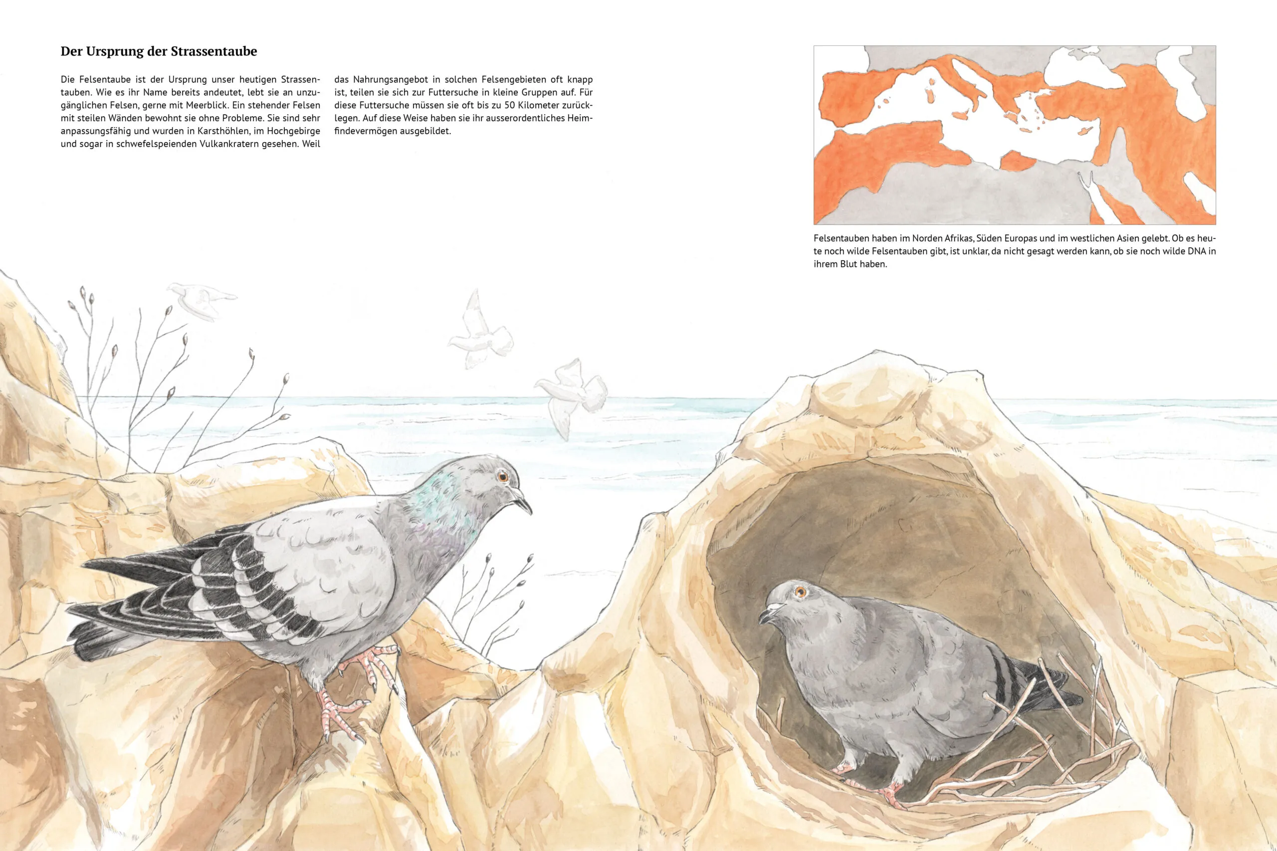 Ausgehend von einem Storyboard, entstand ein Prototyp eines Sachbuchs, welches Betrachtende durch eine visuelle Reise durch die Geschichte der Taube und des Menschen führt. Parallel werden je nach Thematik, verschiedene Fakten vermittelt und Vorurteile gegenüber der Strassentaube geklärt. Ausgearbeitete Doppelseiten geben einen Einblick in die Umsetzung des Inhalts.