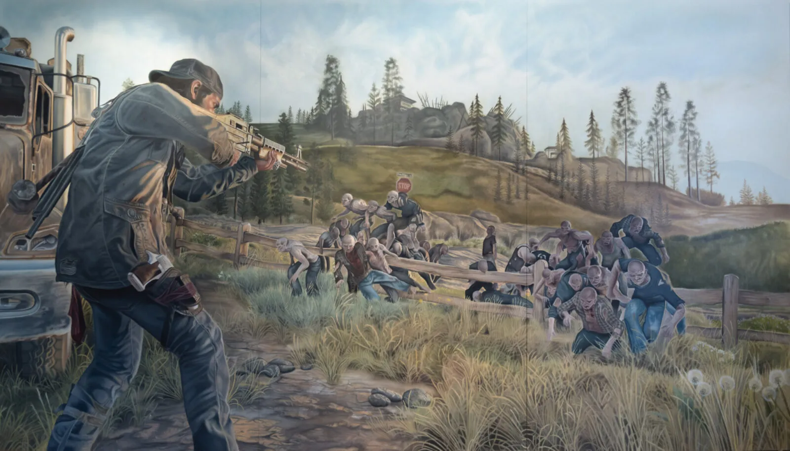 Ich übersetzte einen Screenshot aus dem Videospiel Days gone, in die realistische, detailliertere Malerei. Das Gemälde wird zu einem fiktiven neuzeitigen Historienbild, das sich zwischen Idylle und Schlachtszene bewegt. Das Motiv spielt sowohl auf Amok, Rassismus, Terrorismus wie auch auf unsere Ängste der Wissenschaft an und nimmt Bezug auf die Corona-Krise (Pandemie).