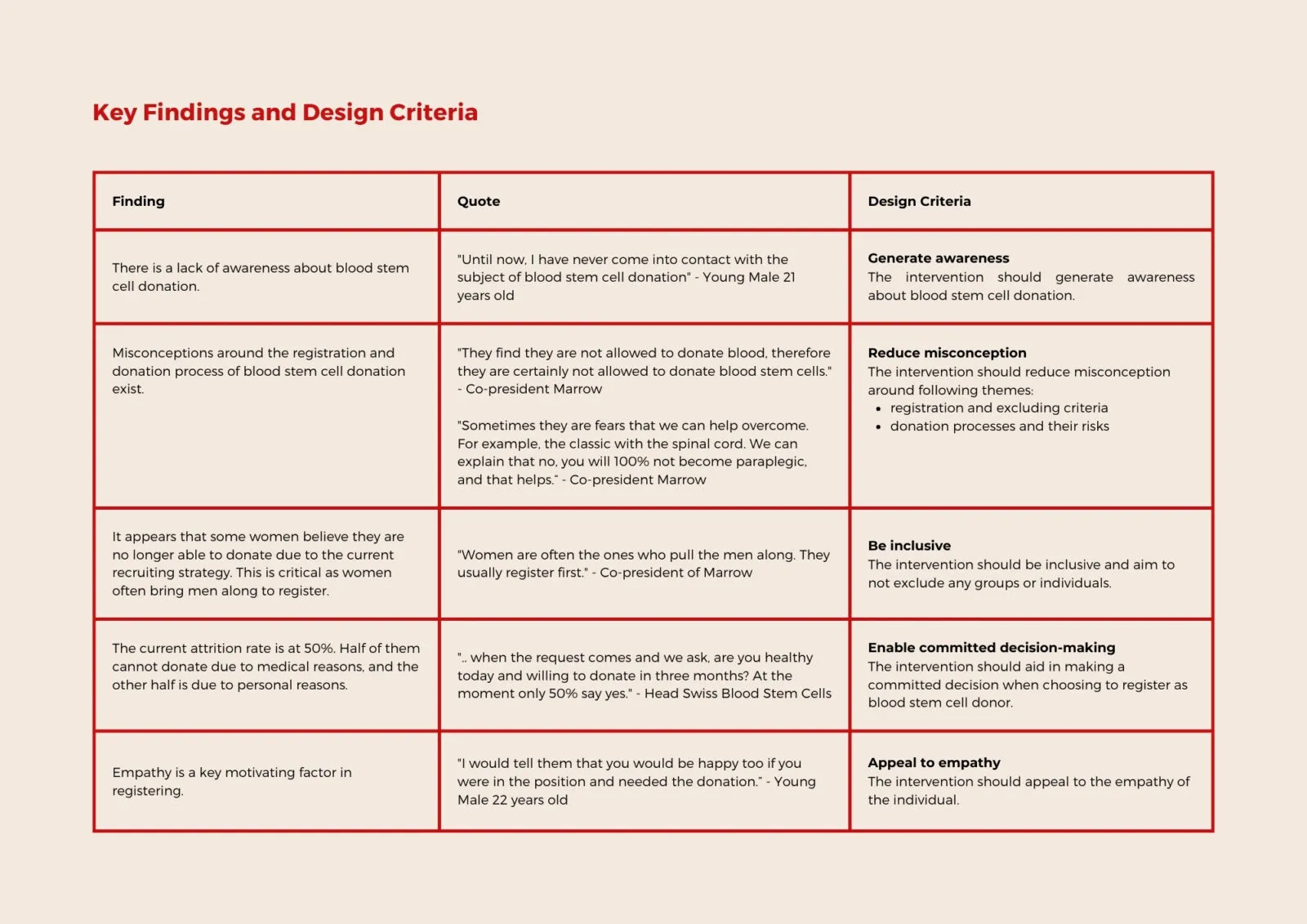 From the research, it became apparent that the key hindering factor is the general lack of awareness of blood stem cell donation. This includes the complete lack of awareness that blood stem cell donation exists and the fact that there are many misconceptions about not only the donation process but also the registration process. What also emerged from the research was that evoking empathy seems to be a key motivating factor to register.