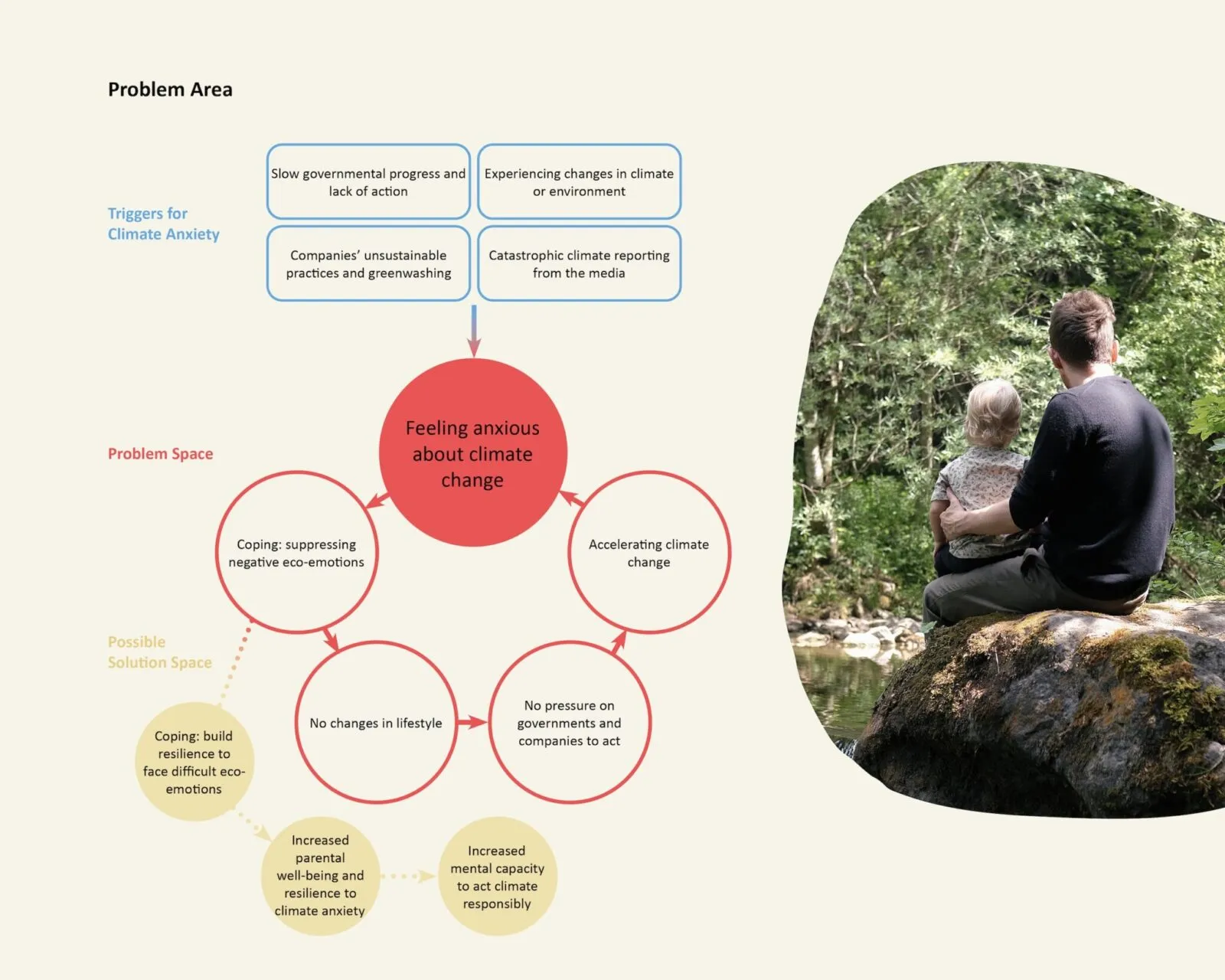 The intervention addresses healthy coping for climate anxiety in the familial context. To tackle the highly complex and systemic root causes of climate anxiety, the issue would need to be addressed on a bigger scale, including substantial actions from other stakeholders like governments and companies to reduce environmental damage. With an individual’s limited capacity to change the situation, personal transformation is needed. Here, the proposed intervention could offer value to parents who are seeking ways to deal with their climate anxiety.