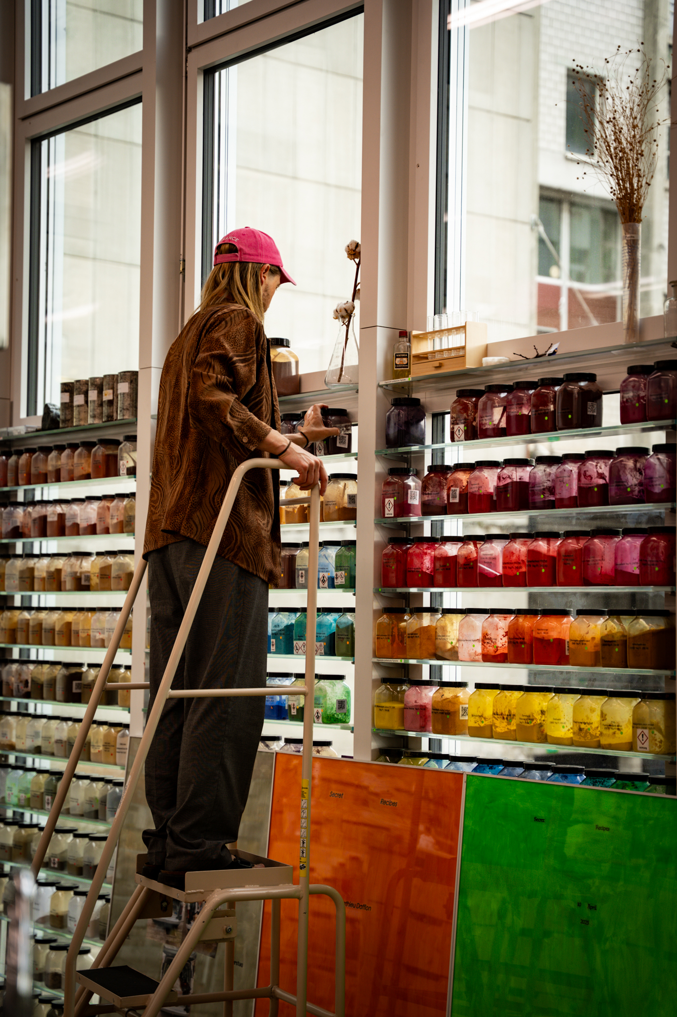 Zwischen Pigmentgläsern und Leinwänden finden sich im Raum für Farben auch die von Ray gestalteten Poster der Gesprächsreihe Secret Recipes.