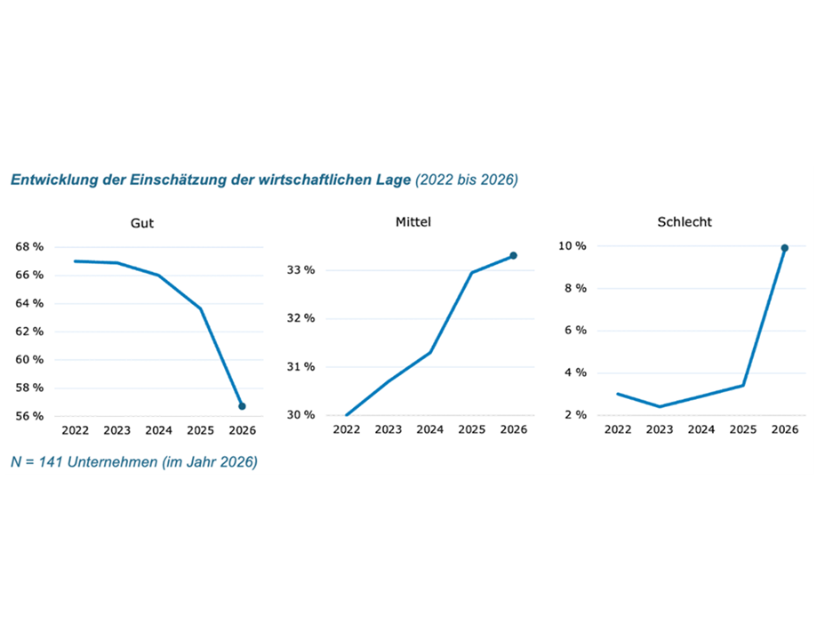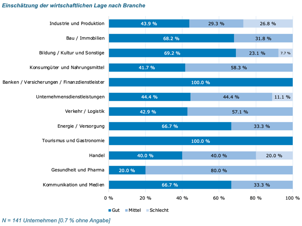 Zwar beurteilt mit 56.7 % weiterhin eine Mehrheit der befragten Unternehmen ihre wirtschaftliche Lage als gut. Dies entspricht jedoch einem Rückgang von knapp 7 %-Punkten gegenüber dem Vorjahr. Besonders hervorzuheben: Der Anteil der Unternehmen, die ihre Lage als schlecht einschätzen, hat sich mit 9.9 % im Vergleich zum Vorjahr fast verdreifacht. Im Vergleich zu den Nachbarländern ist dies aber immer noch eine sehr positive Einschätzung.