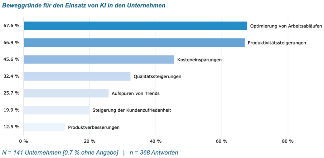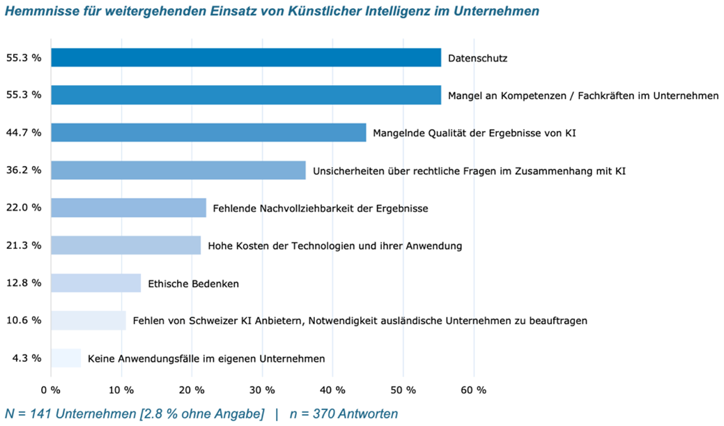 Eine zentrale Erkenntnis der diesjährigen Studie ist der flächendeckende Einzug der Künstlichen Intelligenz. Nur noch 2.8 % der Unternehmen geben an, KI gar nicht zu nutzen. Haupttreiber sind hier die Optimierung von Arbeitsabläufen und Produktivitätssteigerungen. Dennoch gibt es Hürden – Datenschutzbedenken und rechtliche Unsicherheiten verhindern bei vielen Firmen einen noch umfassenderen Einsatz.