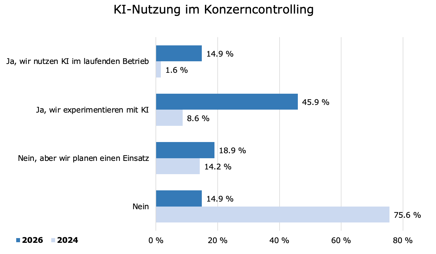 Noch im Jahr 2024 war die Nutzung von KI im Konzerncontrolling eher eine Randerscheinung. Damals gaben über 75 % der befragten Unternehmen an, keinerlei KI-Lösungen einzusetzen. Die aktuelle Auswertung zeigt hier eine deutliche Veränderung: