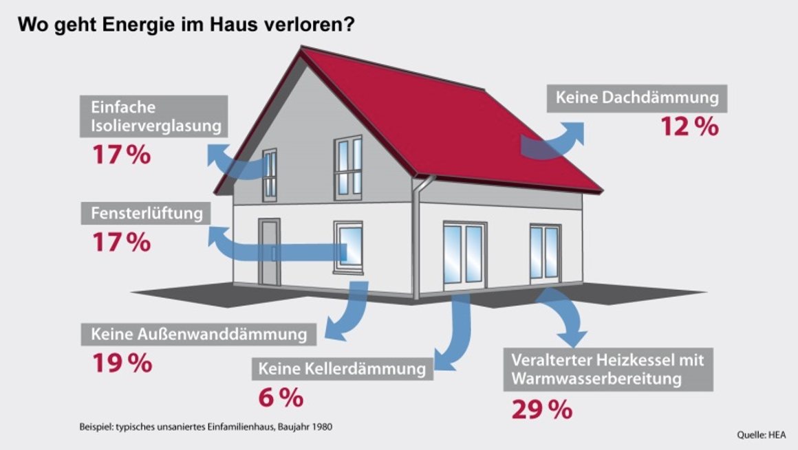 Ein möglichst geringer Energieverbrauch- und verlust ist essenziell für ein autarkes Gebäude. Die optimale Dämmung senkt den Wärmeverlust. Die Wärmerückgewinnung sowie Energieverbrauchoptimierung steigern die Effizienz. LED-Beleuchtungen sowie energieeffiziente Geräte minimieren den Strom-Verbrauch. Wie die nachfolgende Abbildung 3 aufzeigt, können über die Dach- und Aussenwanddämmung bis zu einem Drittel der Energie verloren gehen. Die optimale Dämmung ist somit der Grundstein zur Errichtung energiesparender Häuser und berücksichtigt die gesamte Gebäudehülle. Ein Wärmetauscher reduziert die Wärmeverluste beim Lüften. In Deutschland darf ein Passiv-Haus (besonders energieeffizientes Gebäude) einen Heizwärmebedarf von 15kwh pro m2 Jahr nicht übersteigen. Dadurch benötigt dieses Haus nur Mini-Wärmepumpen (Kümpel, 2023).