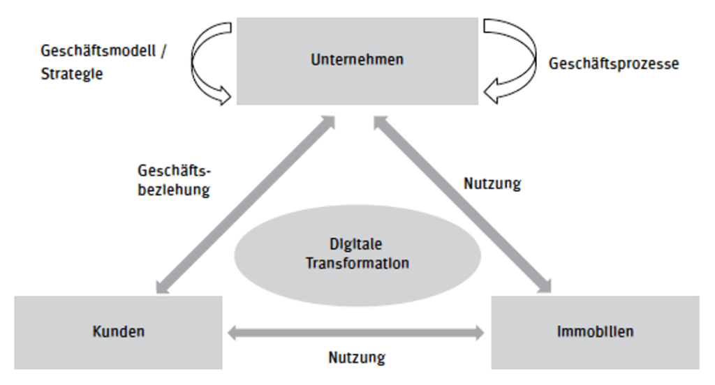 Abbildung 1: Die Grafik zeigt, wie die digitale Transformation Unternehmen, Kunden und Immobilien miteinander vernetzt; Quelle: Künzel (2024, S. 69)