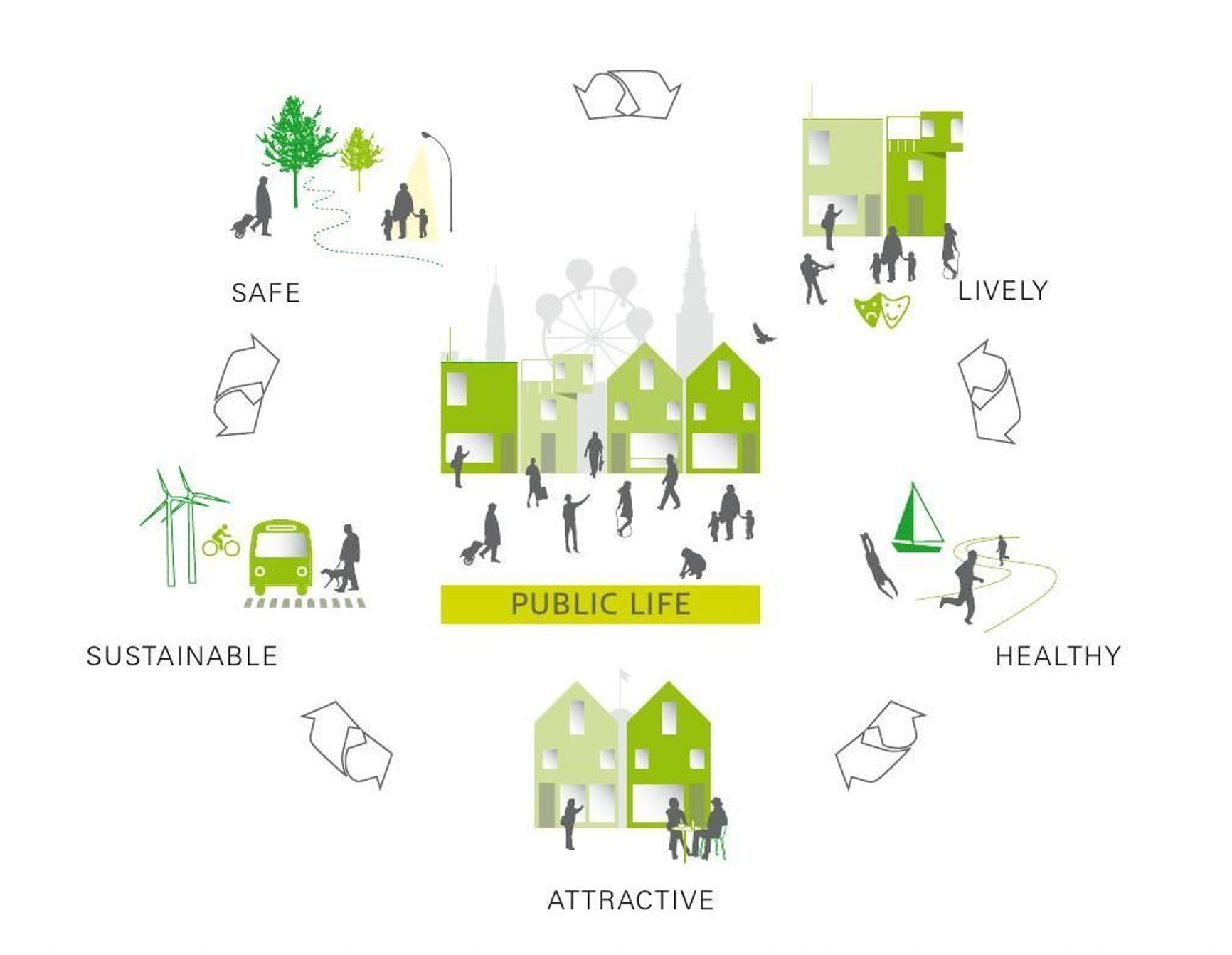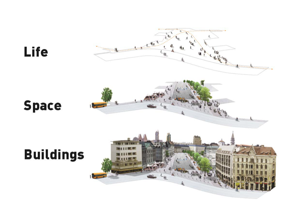 Life – Space – Buildings: Lebendige Innenstädte zeichnen sich durch ein Zusammenspiel mehrerer ineinandergreifender Faktoren aus. Im Zentrum steht die Idee, Städte für Menschen und nicht primär für Autos oder ausschliesslich für den Konsum (Gehl, 2010) zu bauen. Es geht in erster Linie darum, den Raum zwischen den Gebäuden auf der menschlichen Wahrnehmungsebene (Human Scale) so zu planen, dass er erlebbar, sicher und vielgestaltig nutzbar ist – und dabei jeweils individuell gestaltbar bleibt.