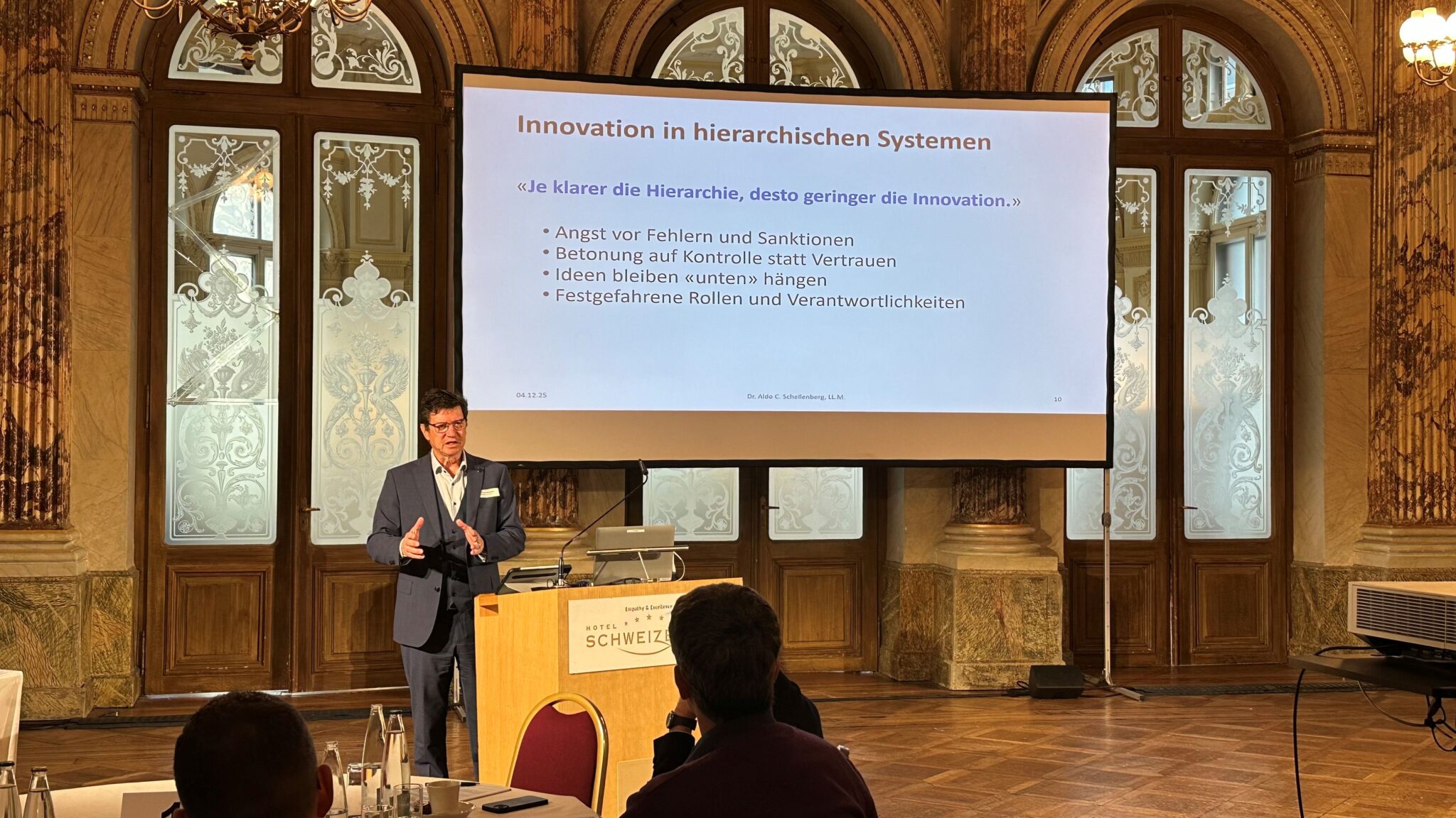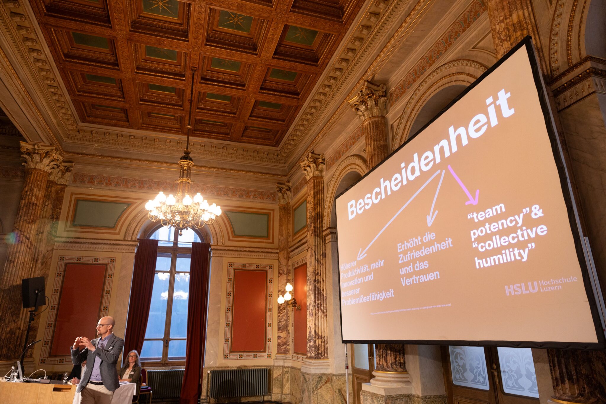 Zum Abschluss richtete Martin Gutmann, Professor für Leadership und Management an der Hochschule Luzern, den Blick auf eine Form von Führung, die häufig unterschätzt wird: Unspektakuläre, stille und zurückhaltende Führung.
