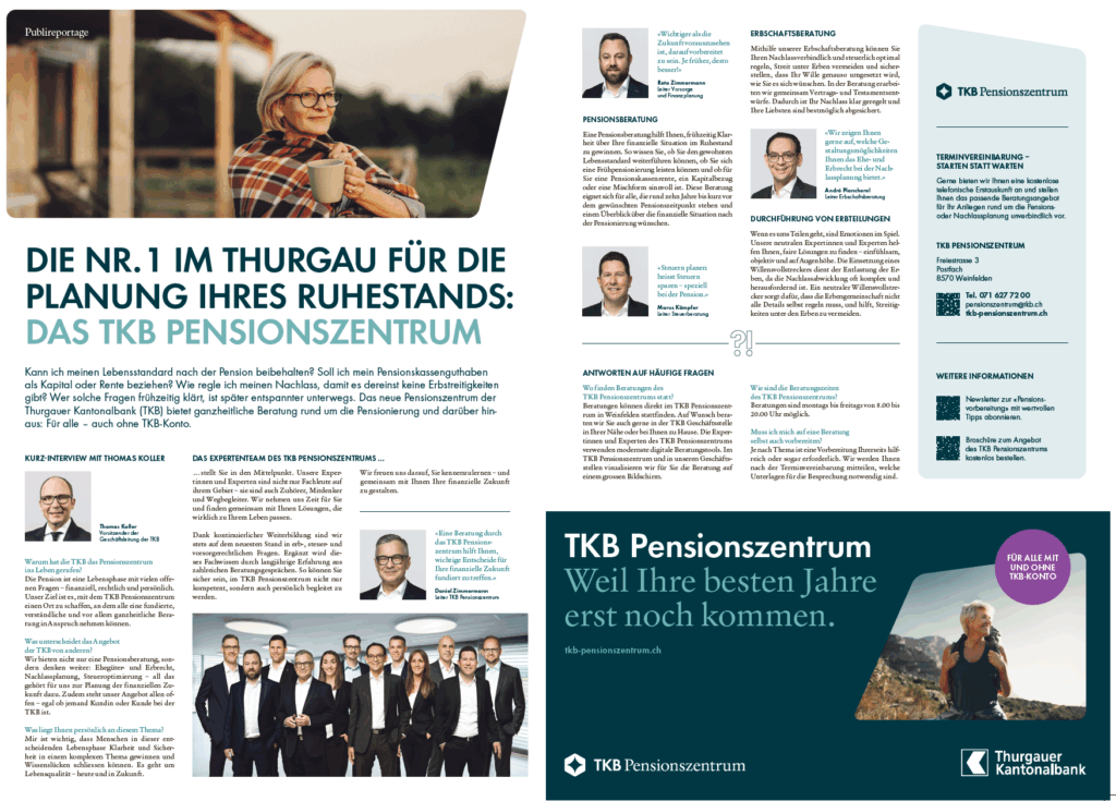 Mit dem Pensionszentrum reagiert die TKB auf eine zentrale Erkenntnis: Kundinnen und Kunden denken bei einer Kantonalbank nicht automatisch an Pensionierung oder Vorsorge. Umso wichtiger ist es, dieses Thema eigenständig und prominent(er) zu positionieren. Die TKB tut dies mit ihrem Pensionszentrum.