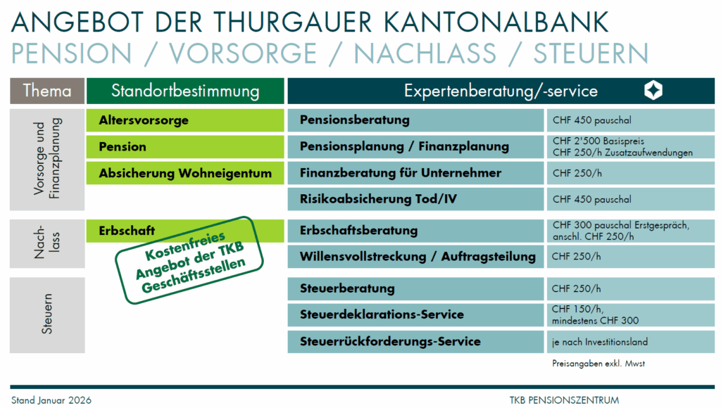 Im TKB Pensionszentrum wird das Expertenwissen der Bank gebündelt – von Steuerfragen über Finanz- und Nachlassplanung bis hin zur konkreten Ausgestaltung des Ruhestands. Die Beratung ist dabei nicht an die Umsetzung über Produkte der TKB gekoppelt. Kundinnen und Kunden können ihre Pensionierungsstrategie im Pensionszentrum entwickeln und die Umsetzung bewusst offenhalten oder bei einer anderen Bank vornehmen. Dies ist aus meiner Sicht wichtig, denn damit betrachtet die Kundschaft das Pensionszentrum als unabhängige Anlaufstelle.