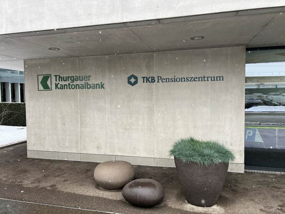 Die Markenstrategie der Thurgauer Kantonalbank anzupassen und eine neue Submarke einzuführen, war aus meiner Sicht eine folgerichtige Entscheidung. Mit dem «TKB Pensionszentrum» wurde ein sichtbarer, eigenständiger neuer Brand geschaffen– prominent platziert, unter anderem auf einem Anbaugebäude der Thurgauer Kantonalbank in Weinfelden (siehe mein Bild, das ich beim TKB-Besuch gemacht habe).