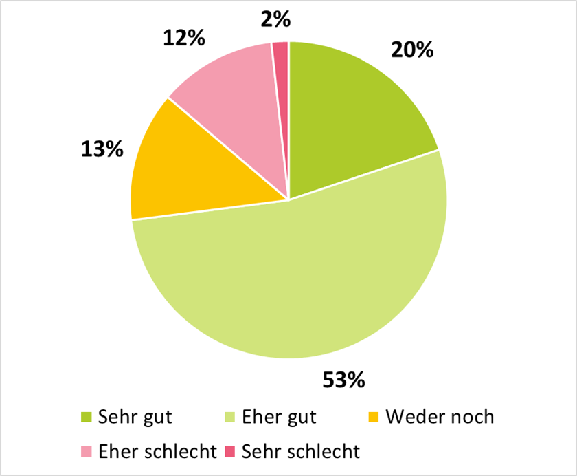 Auch beim Thema Work-Life-Balance zeigt sich zunächst ein positives Bild. 57 % der Befragten geben an, eher oder sehr zufrieden mit ihrer Work-Life-Balance zu sein. Der Anteil der Personen, die eher oder sehr unzufrieden ist, ist hier mit 28 % jedoch relativ hoch und zeigt damit Handlungsbedarf.