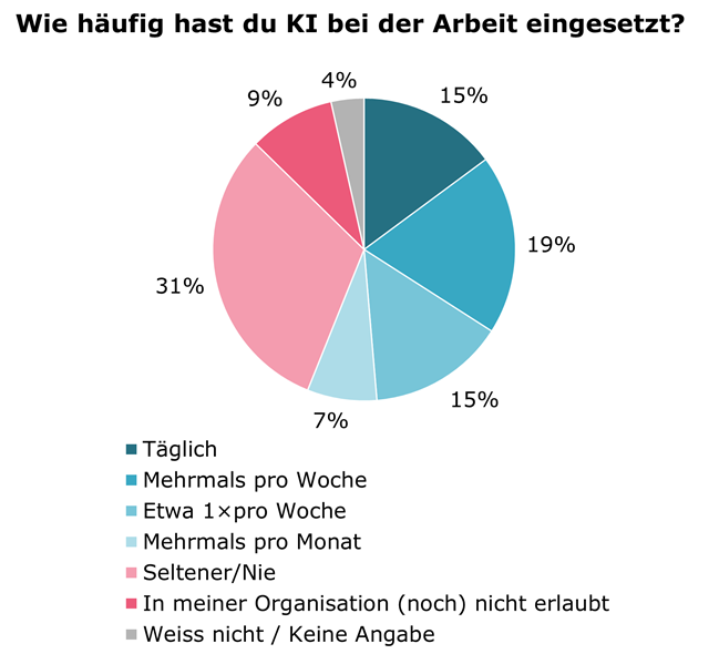 Fast ein Drittel, nämlich 31 % der Befragten gibt hingegen an, KI selten oder nie für die Arbeit einzusetzen und in 9 % der Fälle wurde angegeben, dass KI im jeweiligen Finanzinstitut (noch) nicht erlaubt ist.