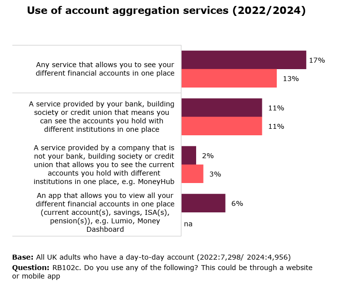 Abbildung 3: Nutzung von Kontoaggregationsdiensten in Grossbritannien, 2022 und 2024 (Anteil der Erwachsenen mit einem Alltagskonto, die ihre verschiedenen Finanzkonten in einer Übersicht zusammenführen können, in %; Quelle: FCA, 2025)