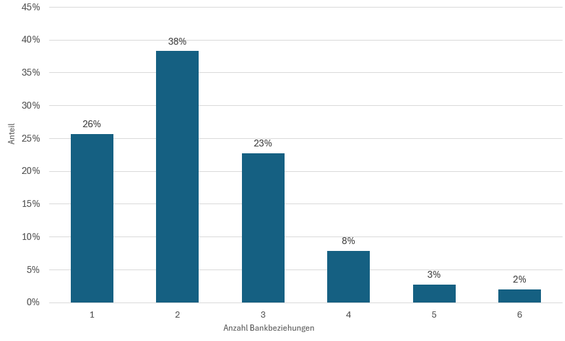 Ausgangspunkt für die Beantwortung dieser Frage ist eine Analyse, wie viele Bankkonten eine durchschnittliche Schweizerin beziehungsweise ein durchschnittlicher Schweizer besitzt. Multibanking – beziehungsweise die damit verbundene Kontoaggregation – ist nur für jene Kundinnen und Kunden relevant, die mindestens zwei Bankbeziehungen pflegen.